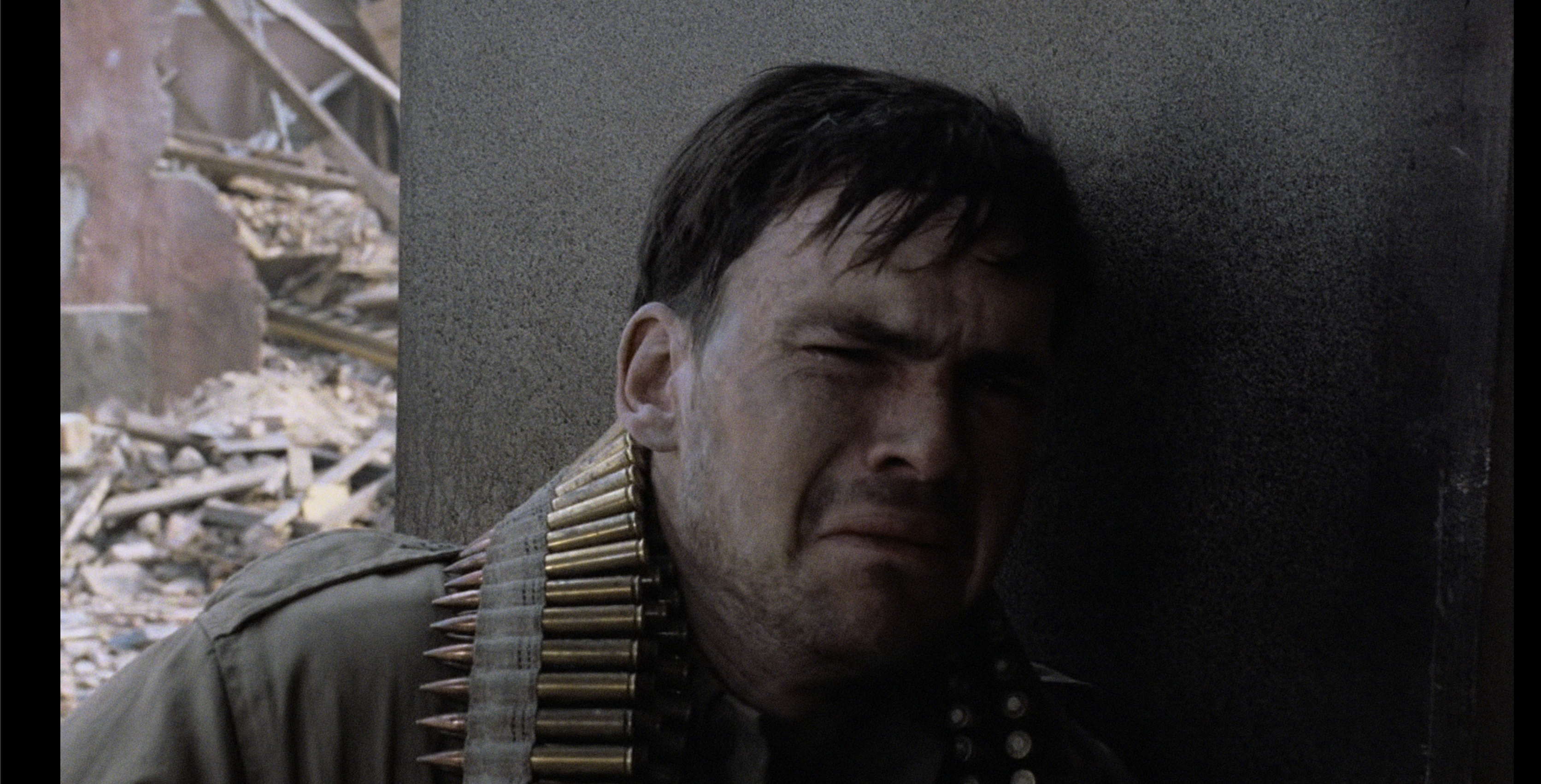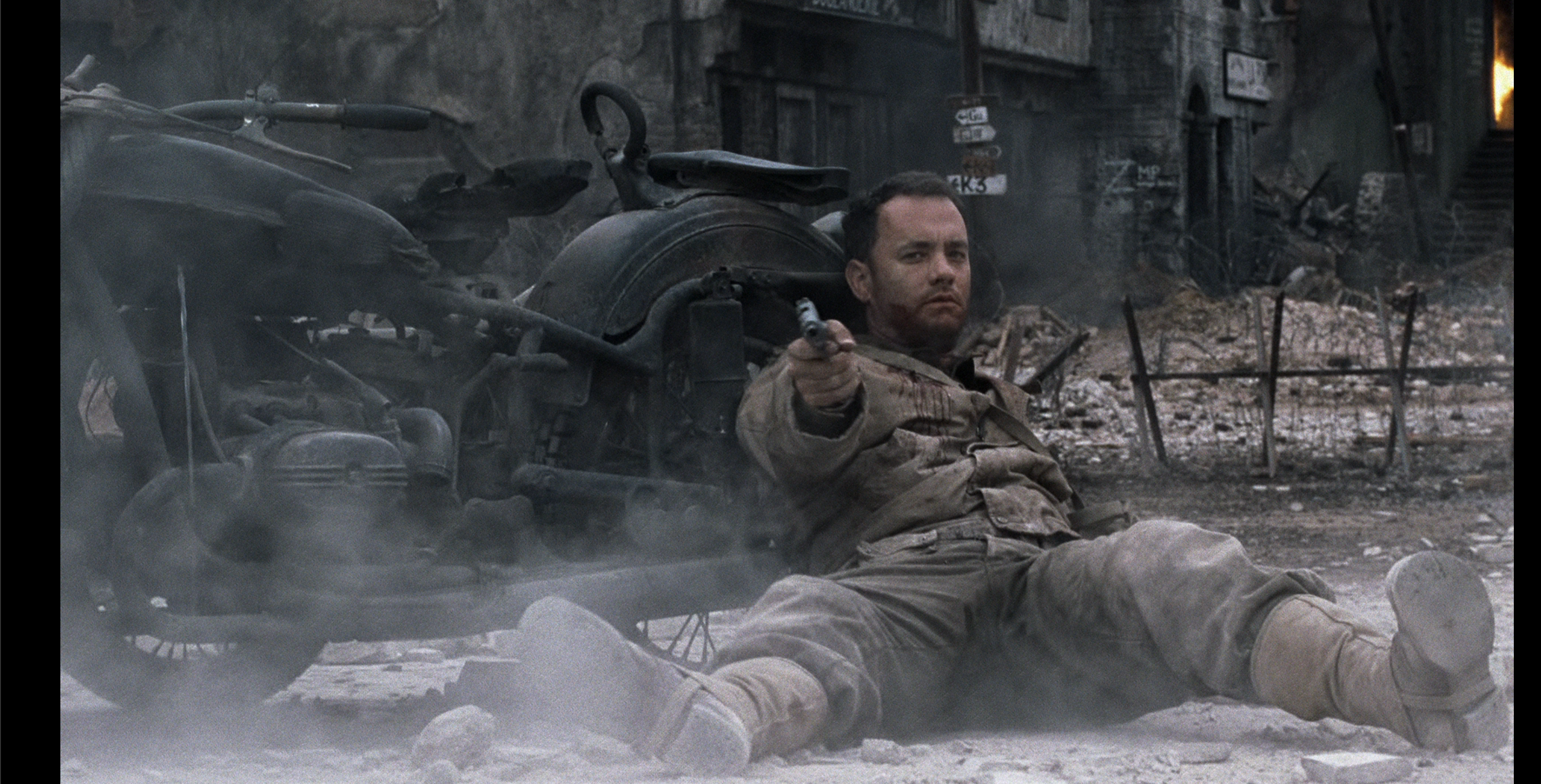그러다가 밀러대위가 눈앞에서 자신이 아끼던 부하가 죽고, 수없이 몰려드는 적군에 허망함, 무력함을 느끼며 더이상 이길 구멍이 없다는 현실을 마주하고 망연자실하며, 어쩌면 이 현실에 분노하며. 눈 앞에 저 탱크 따위가 사랑하는 고국으로, 아내의 곁으로 돌아가는 길을 막았다는 허탈함에 이미 총을 가슴팍에 맞은 중상의 상태로 바닥에 그대로 기대앉아 소총으로 탱크를 겨눈다.